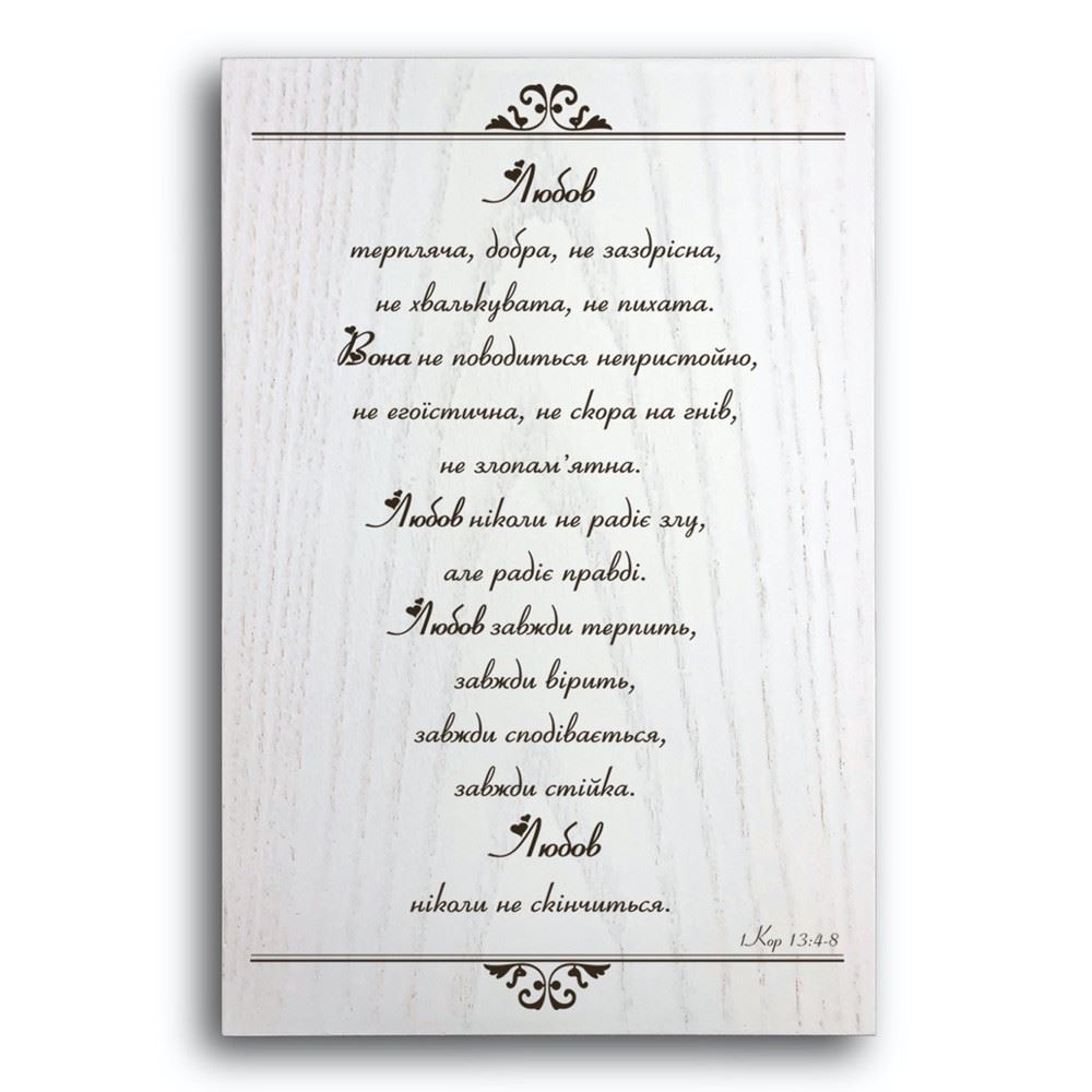 Декоративна дерев'яна плакета "Любов терпляча, добра, не заздрісна, не хвалькувата, не пихата"