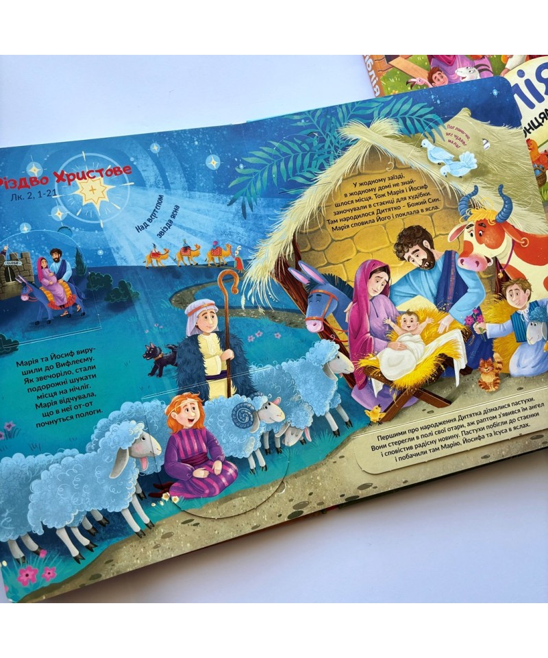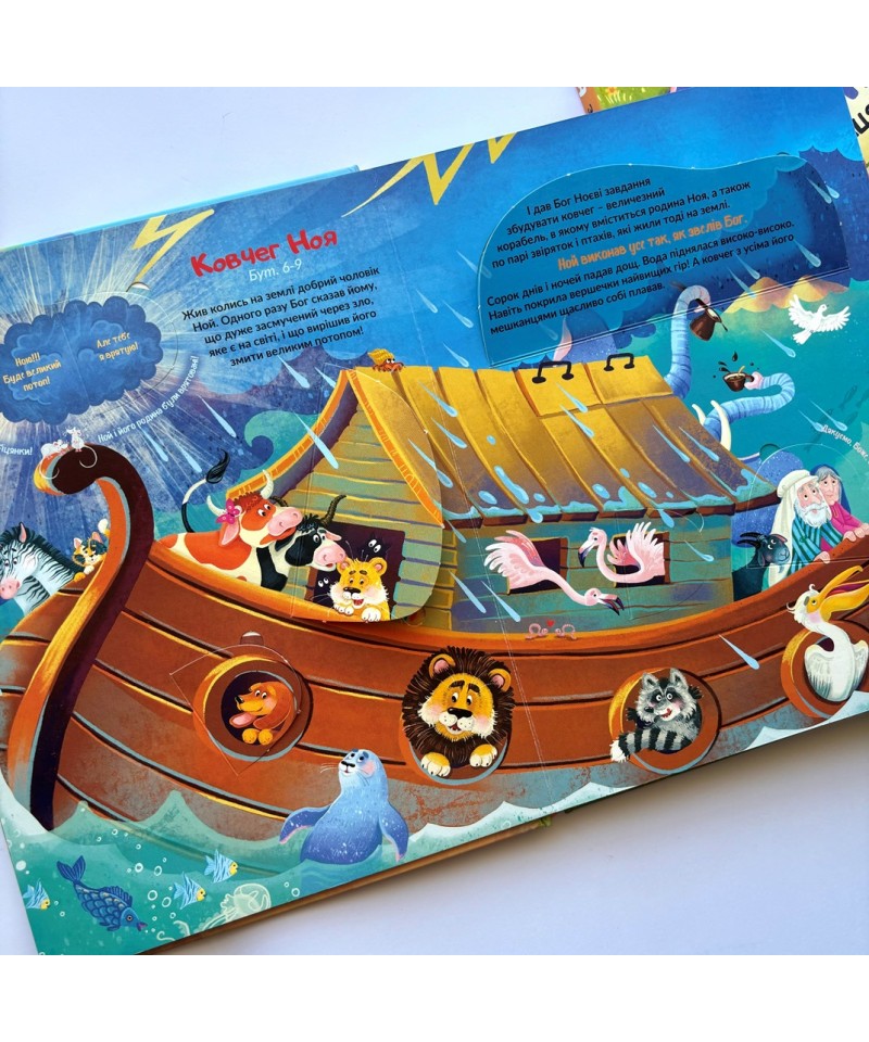 7 барвистих розгорток присвячено 8-м Біблійним темам: Сотворення, Ковчег Ноя, Давид і Голіаф, Різдво, Нагодування хлібом, Добрий самарянин, Розп'яття — Воскресіння. Чудові ілюстрації і стислі тексти закомпоновані у потайні віконця, відкриваючи які дитині буде цікаво і весело знайомитися з біблійними історіями.