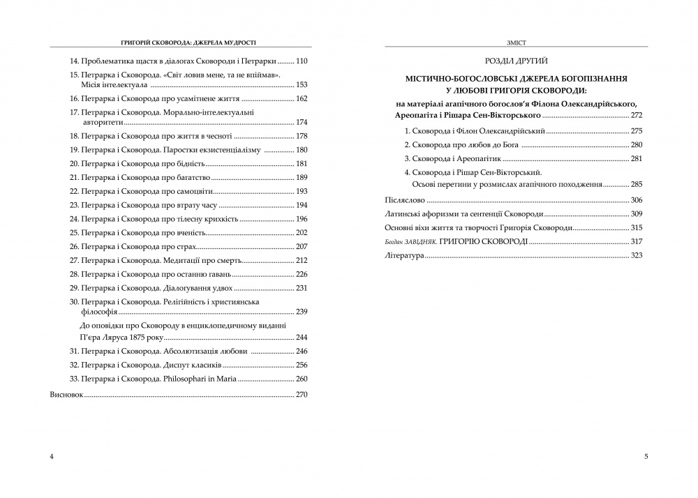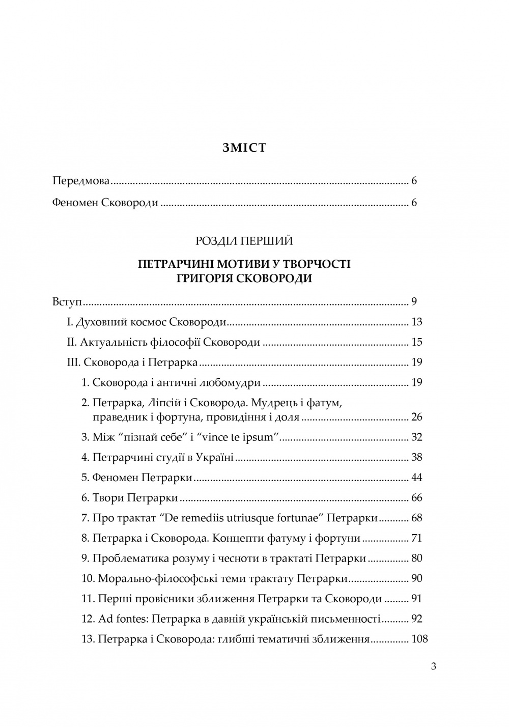 У книзі здійснено порівняльний аналіз містичних, схоластичних та гуманістичних джерел філософії Григорія Сковороди. Висвітлено вплив на становлення українського мудреця трактатів Філона Олександрійського, Ареопагітика, Рішара Сен-Вікторського. Вперше співставляються спільні мотиви моральної філософії Григорія Сковороди та Франческо Петрарки.