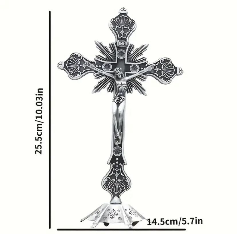 Виготовлений із міцного металу з деталізованим зображенням Розп’яття. Стійка основа — зручно розміщується на столі, полиці чи вівтарі Компактний розмір, який пасує до будь-якого інтер’єру Підходить для щоденної молитви, духовної підтримки.