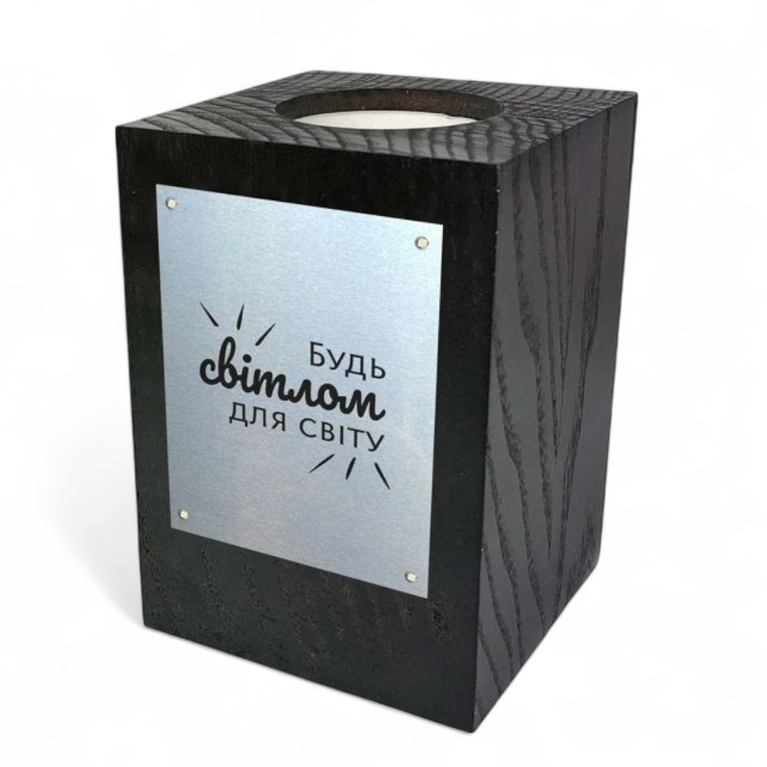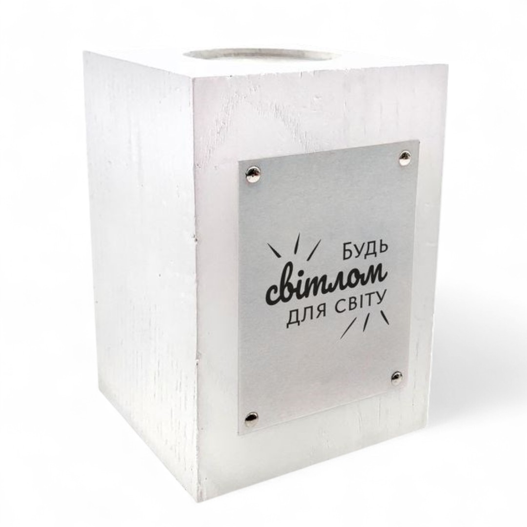 Дерев'яний підсвічник з металевою вставкою "Будь світлом для світу" Світлий/Темний