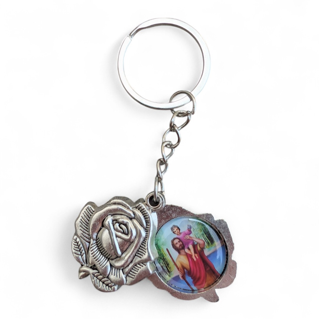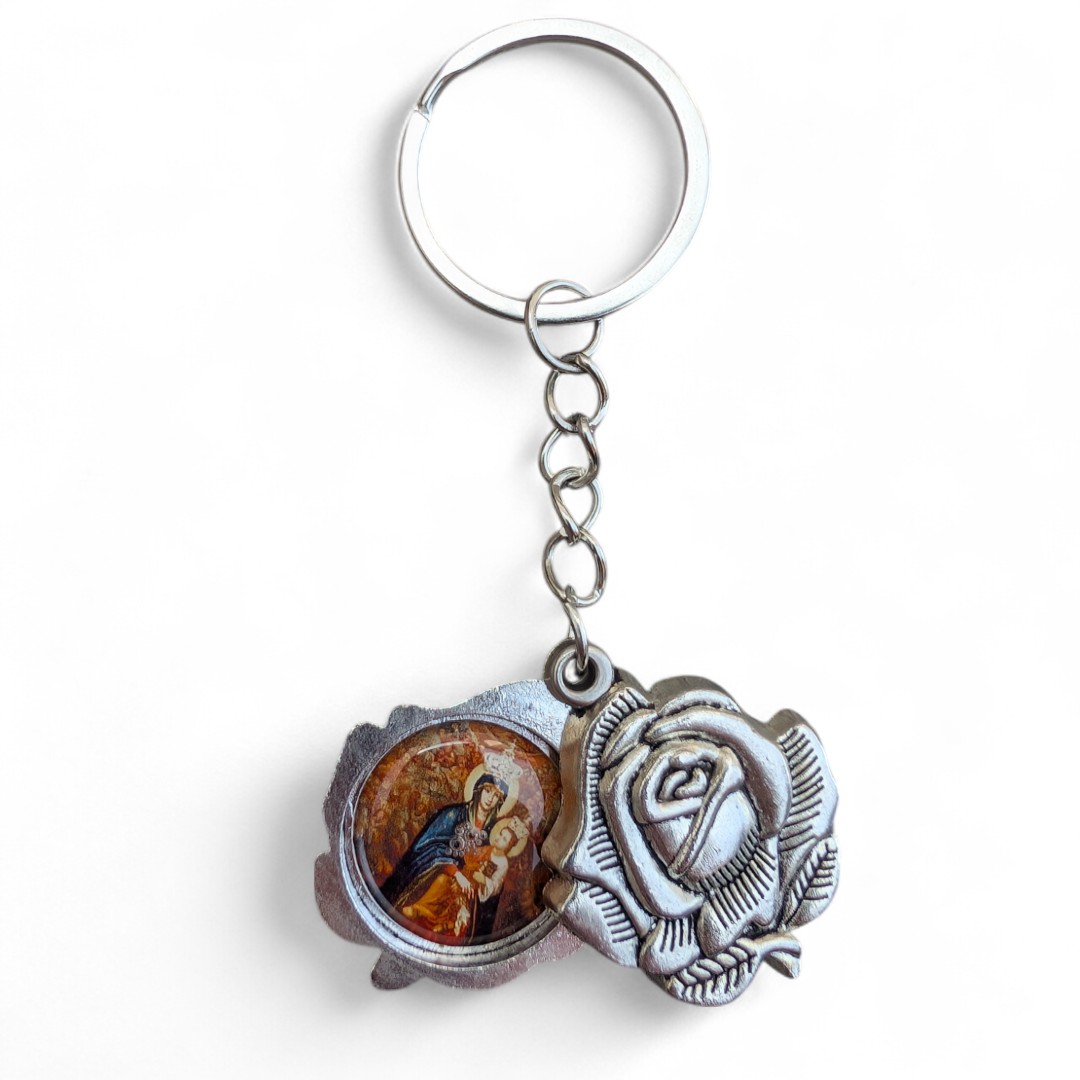 Стильний та символічний аксесуар — металевий брелок із зображенням Святого Христофора та Матері Божої Бердичівської.