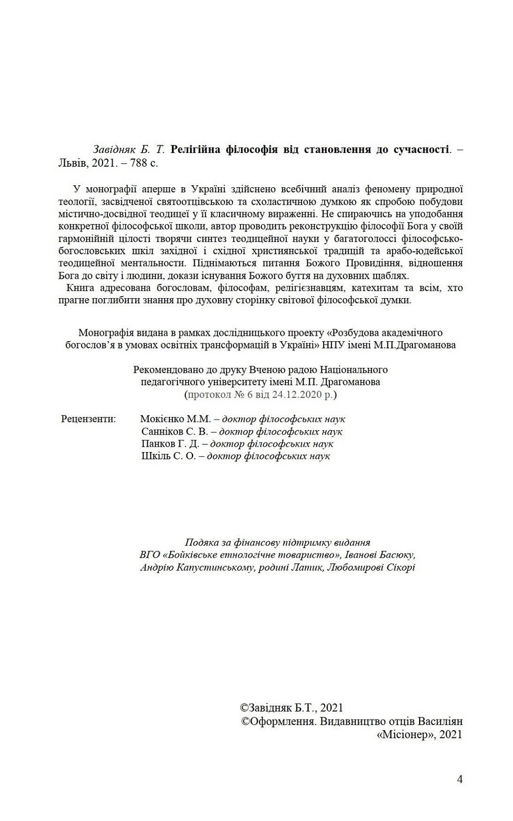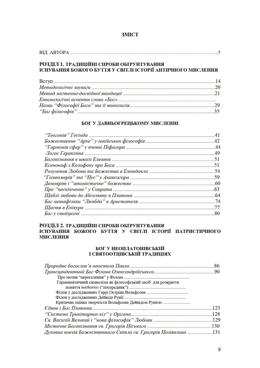 У монографії вперше в Україні здійснено всебічний аналіз феномену природної теології, засвідченої святоотцівською та схоластичною думкою як спробою побудови містично-досвідної теодицеї у її класичному вираженні. Не спираючись на уподобання конкретної філософської школи, автор проводить реконструкцію філософії Бога у своїй гармонійній цілості творячи синтез теодицейної науки у багатоголоссі філософсько-богословських шкіл західної і східної християнської традицій та арабо-юдейської теодицейної ментальности. Дається критичний аналіз множині тлумачень теорій Божого Провидіння, відношення Бога до світу і людини, доказів існування Божого буття.