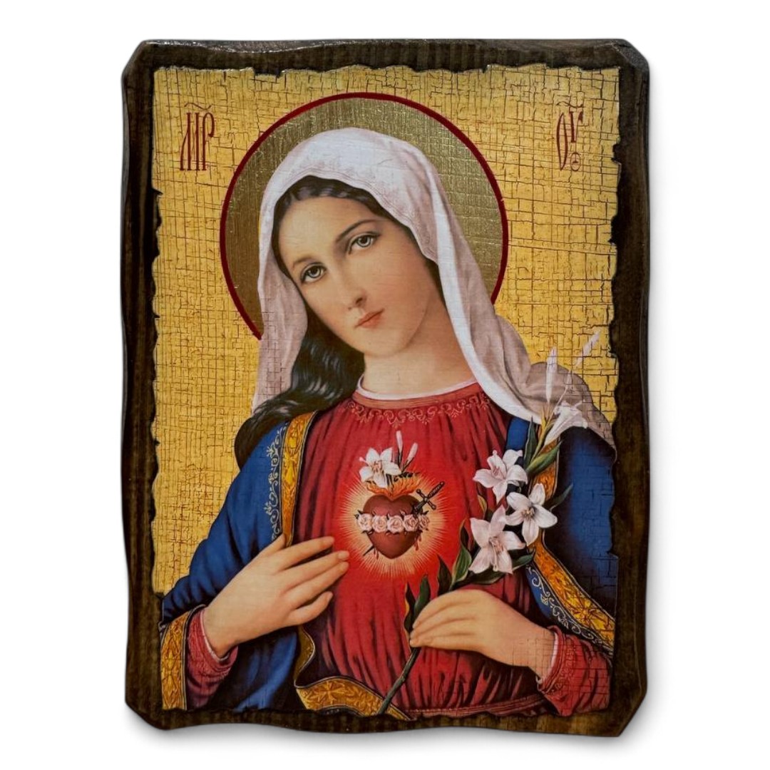 Ікона "Непорочне Серце Діви Марії" — це величний образ Божої Матері, яка з ніжністю та любов’ю утримує своє Непорочне Серце, яке символізує чистоту, самопожертву та безмежну материнську любов до всіх дітей Божих. Вона — покровителька і заступниця для тих, хто шукає розраду, захист і підтримку.