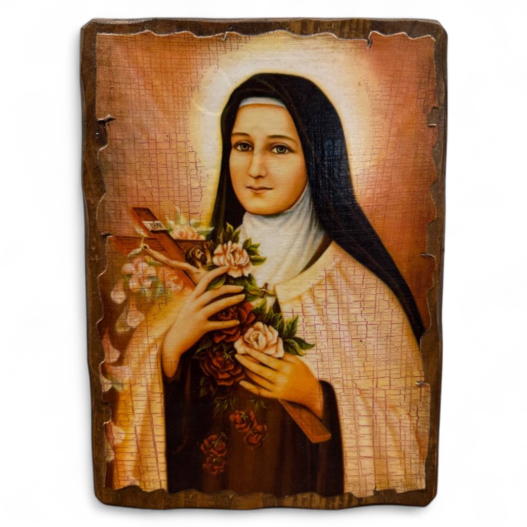 Ікона Святої Терези від Дитятка Ісуса зображає одну з найулюбленіших святих католицької Церкви — покровительку місій, душ у скруті та всіх, хто прагне духовної простоти. У руках вона тримає троянди — символ її «малого шляху» довіри, любові та жертовності.