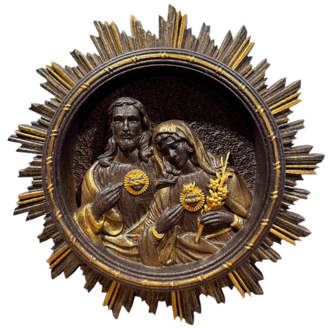 Ця вишукана різьблена ікона зображає Пресвяте Серце Ісуса та Непорочне Серце Марії — два джерела Божої любові, милосердя й заступництва. Вона є глибоким символом духовної єдності Спасителя і Його Матері з кожним вірним серцем.