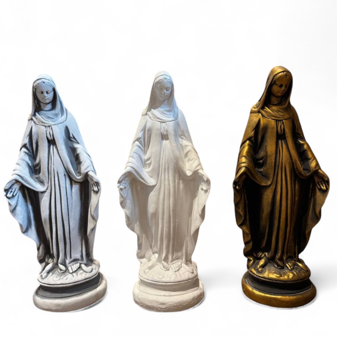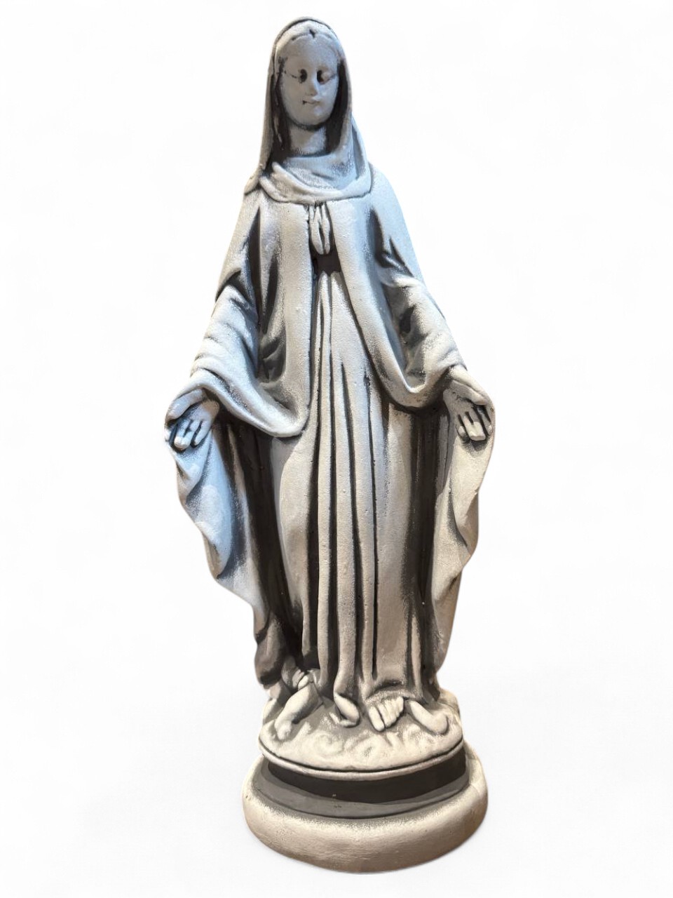 Велична бетонна фігура Матері Божої з розкритими руками, що символізує відкритість, милосердя та прийняття. Образ Богородиці з широко розставленими руками уособлює Її заступництво, теплу материнську опіку та поклик до миру і єдності.