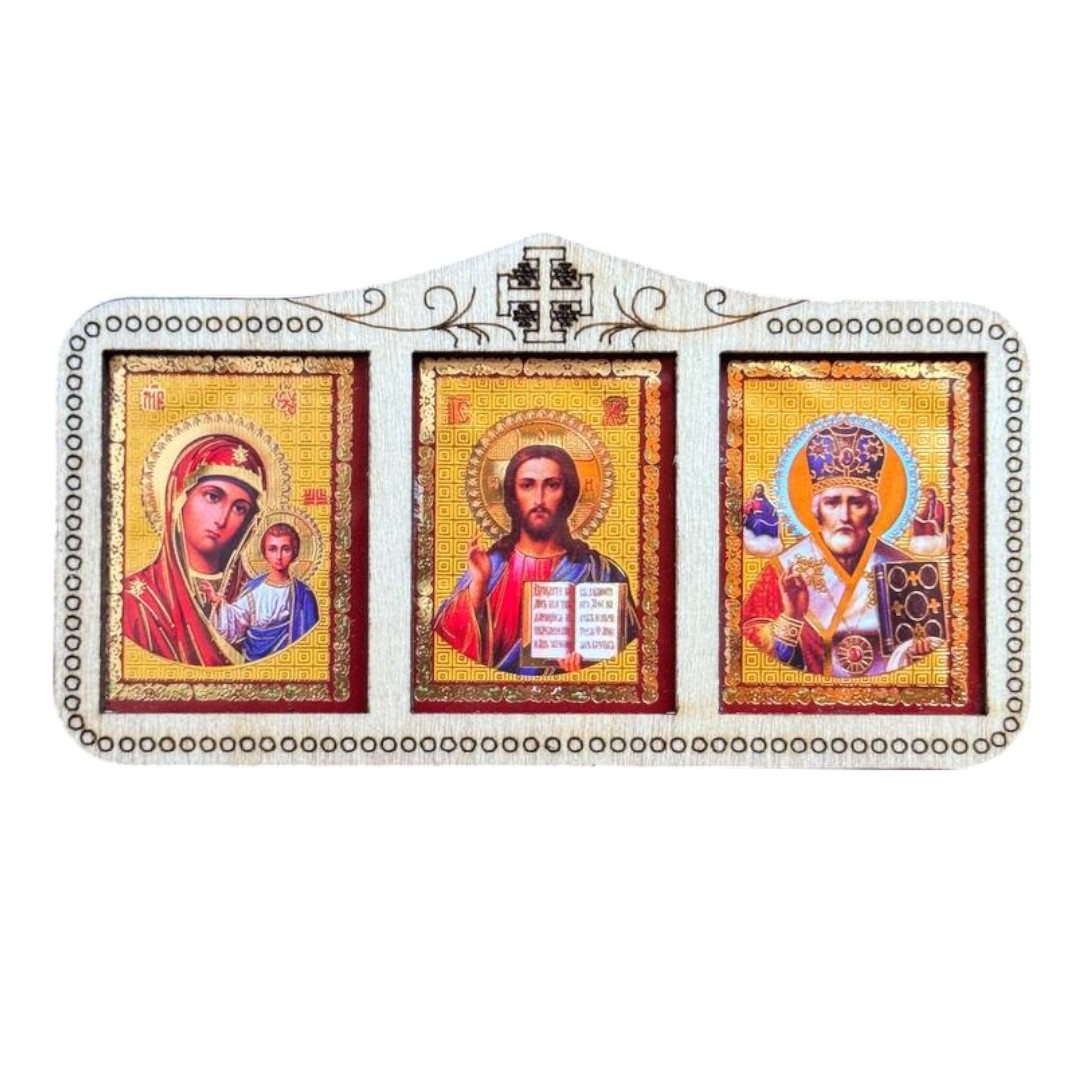 Невеликий триптих для автомобіля з зображенням Матері Божої, Ісуса Христа та Святого Миколая — духовний оберіг у дорозі. Ікони виконані у традиційному стилі та розміщені на зручній панелі з клейкою основою, що дозволяє легко закріпити триптих на панелі приладів або іншій гладкій поверхні в салоні авто.