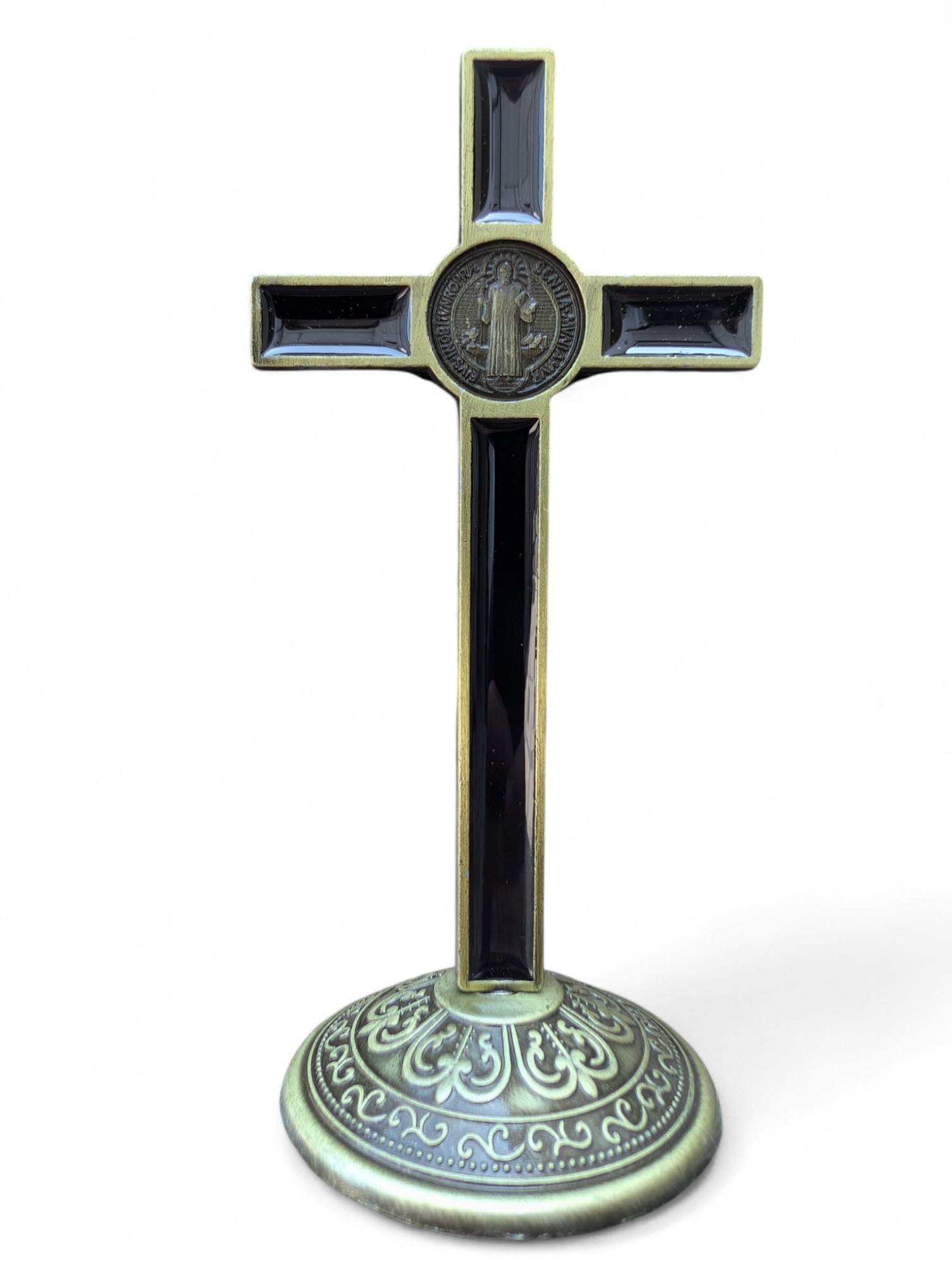 Стильний металевий хрест у вінтажному виконанні з вбудованою медаллю святого Бенедикта — потужний духовний символ захисту від зла, спокуси та негараздів. Медаль містить традиційні латинські написи з молитвою проти зла, відомою як «Хрест Святого Бенедикта».
