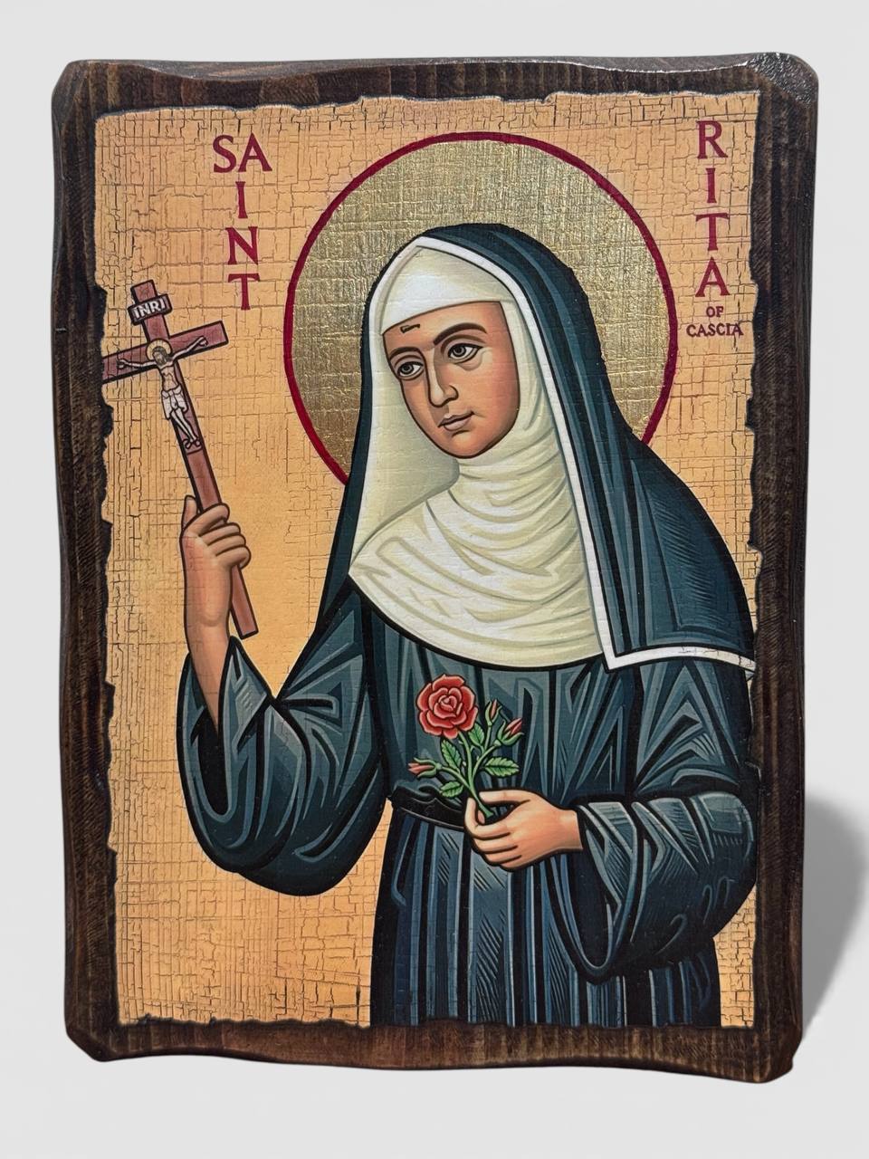 Ікона Святої Рити виконана у стилі під старовину на натуральному дереві. Завдяки ефекту зістарення ікона має особливий вінтажний вигляд, що нагадує давні святині та створює глибоку молитовну атмосферу.