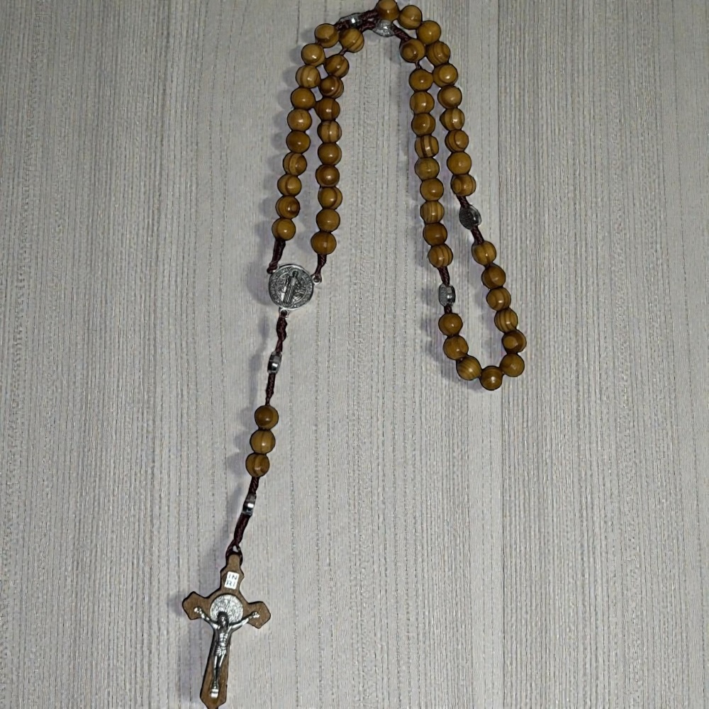Дерев’яний розарій Святого Бенедикта — це поєднання класичної простоти та духовної сили. Натуральні дерев’яні намистини приємні на дотик і зручні для щоденної молитви, а медальйон Святого Бенедикта є символом віри та Божого захисту. Ідеальний для домашньої молитви, носіння з собою або як духовний подарунок.