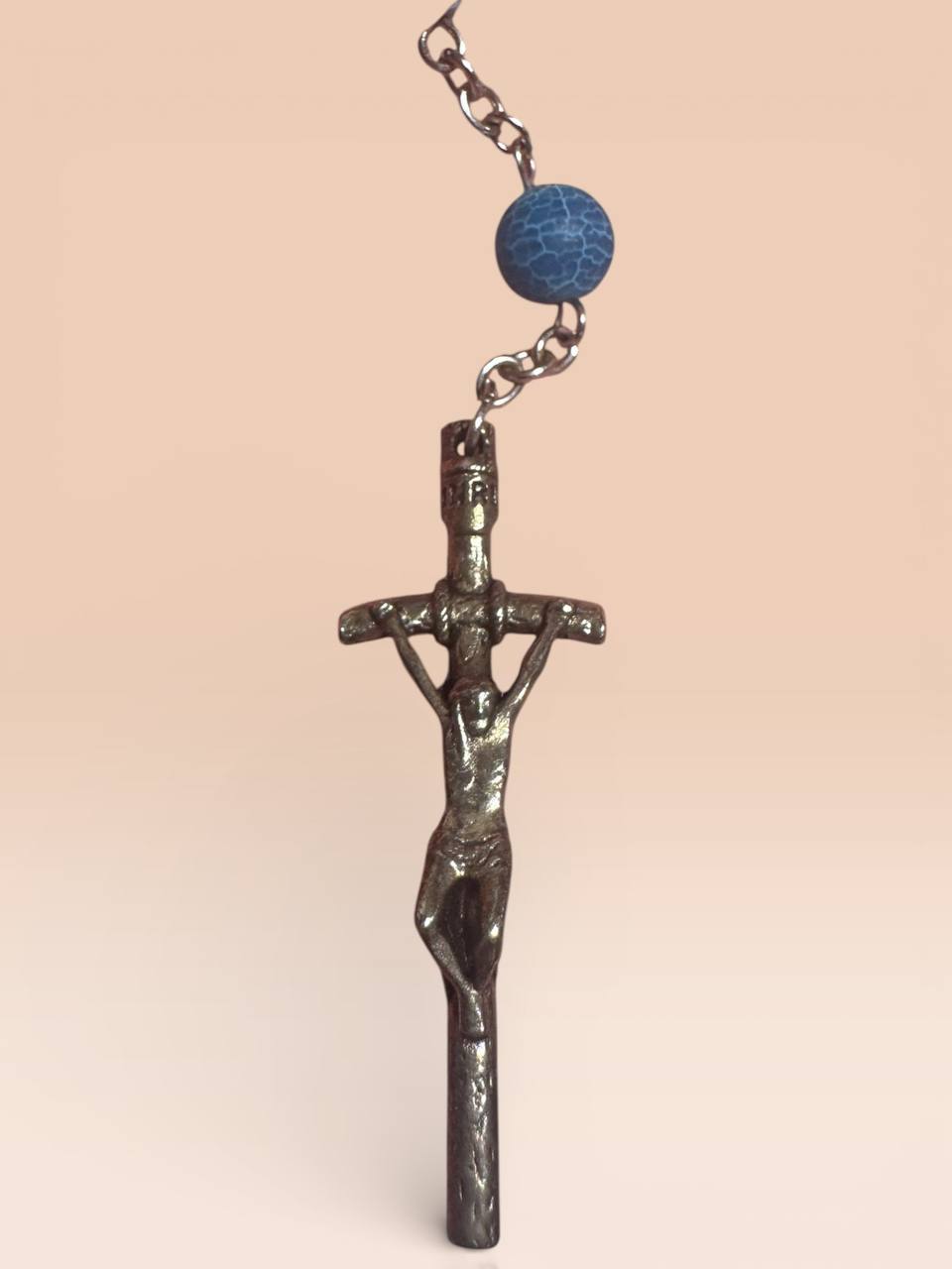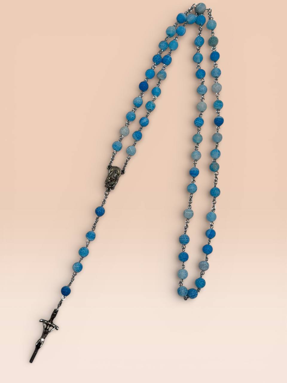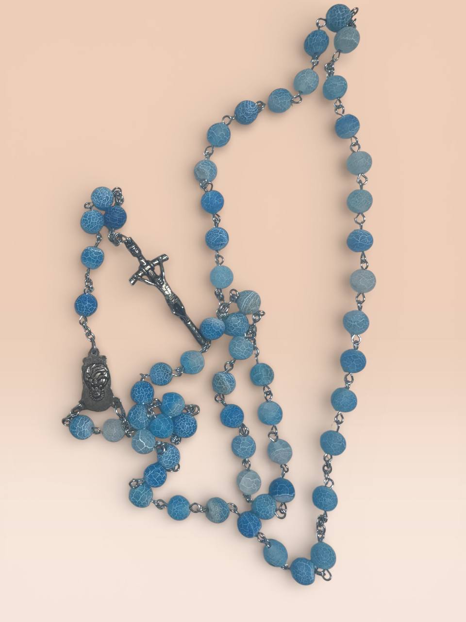 Розарій з морозного каміння – блакитного агату вирізняється ніжним кольором та матовою фактурою, що надає йому особливої елегантності. Натуральні камінці приємні на дотик і роблять розарій зручним для щоденної молитви. Чудовий вибір для особистого використання або як духовний подарунок.