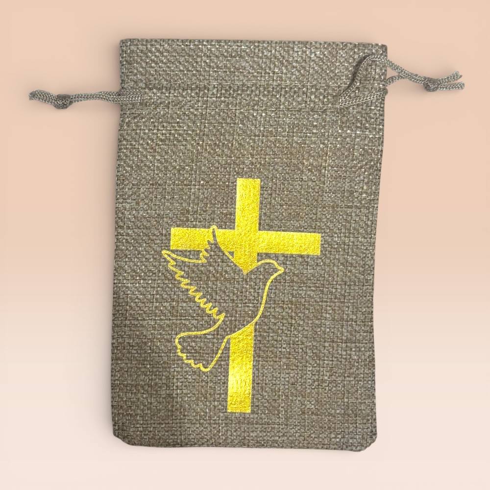 Мішечок з мішковини на джгуті — простий і практичний аксесуар для зберігання розарію або інших молитовних атрибутів. Натуральний матеріал захищає виріб від пилу та подряпин, а джгут забезпечує зручне закривання та носіння. Ідеальний для дому, подорожей або як подарунок разом із розарієм.
