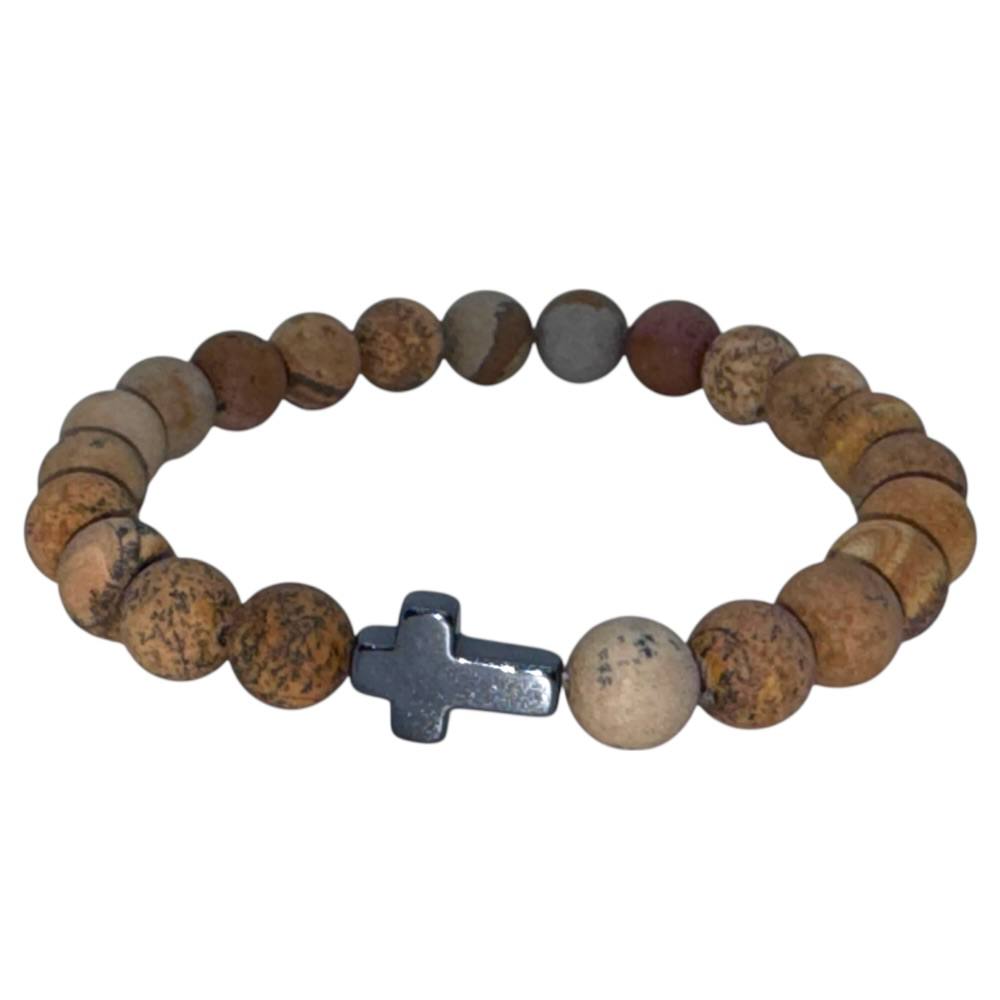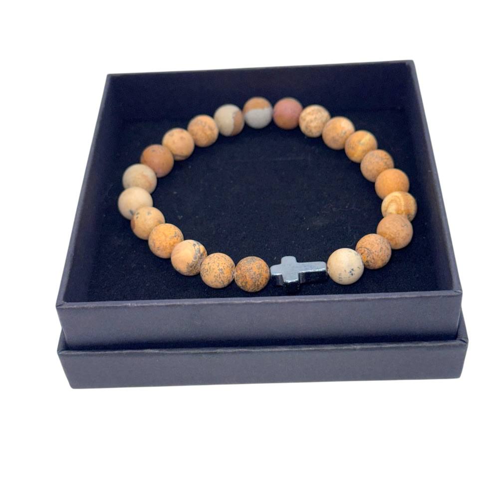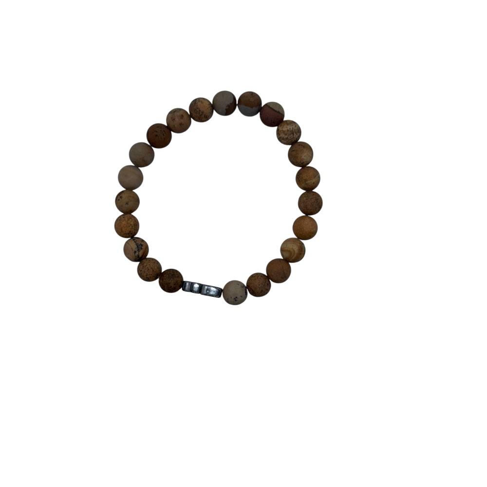 Браслет виготовлений із натуральної яшми з намистинами діаметром 8 мм. Неполірований камінь зберігає природну фактуру та унікальний візерунок, що підкреслює його автентичну красу.