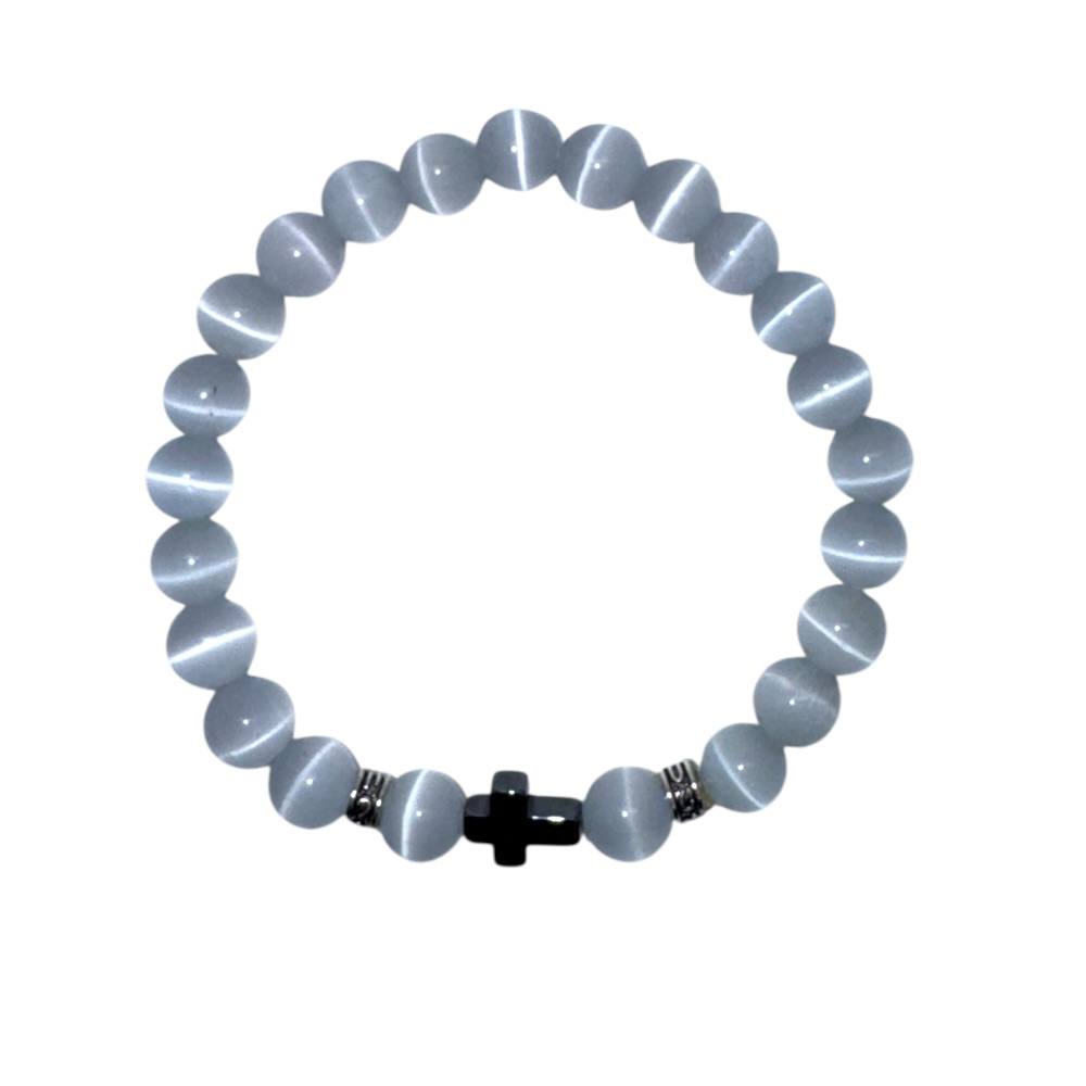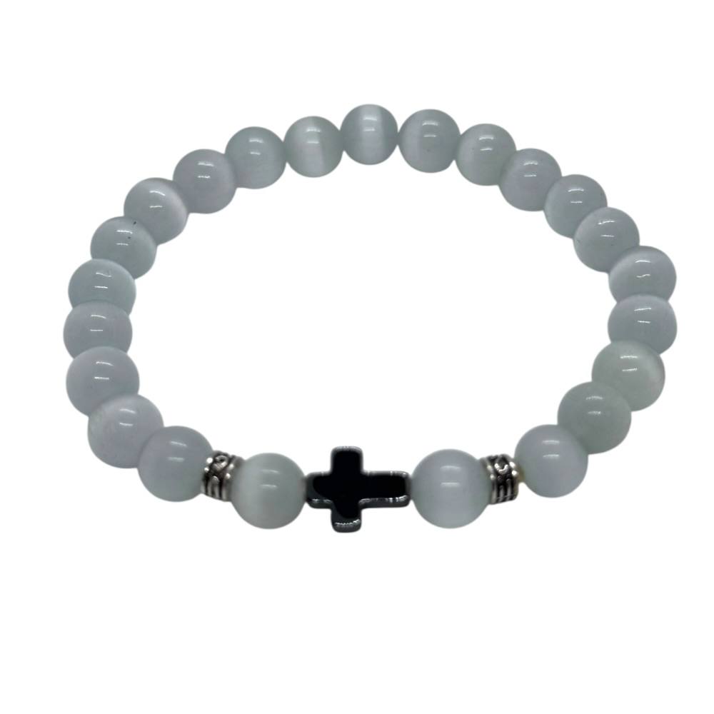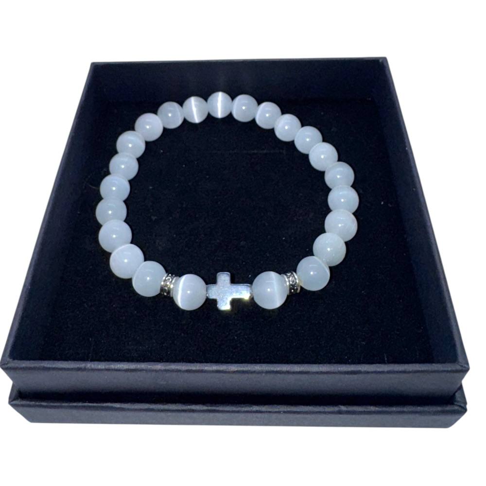 Браслет виготовлений із натурального адуляру з намистинами діаметром 8 мм. Глянцева обробка підкреслює ніжне внутрішнє сяйво каменю та його природну гру світла.