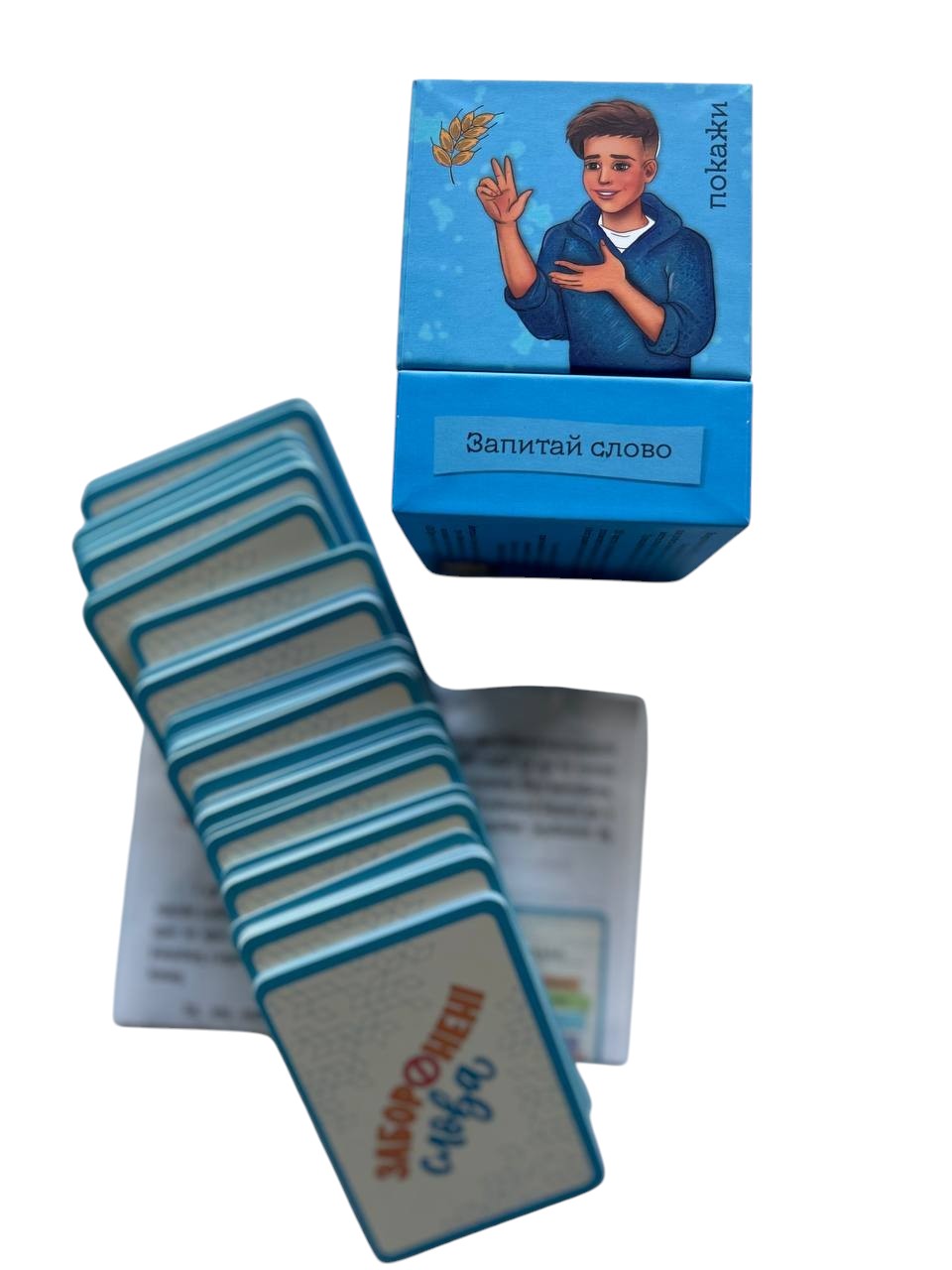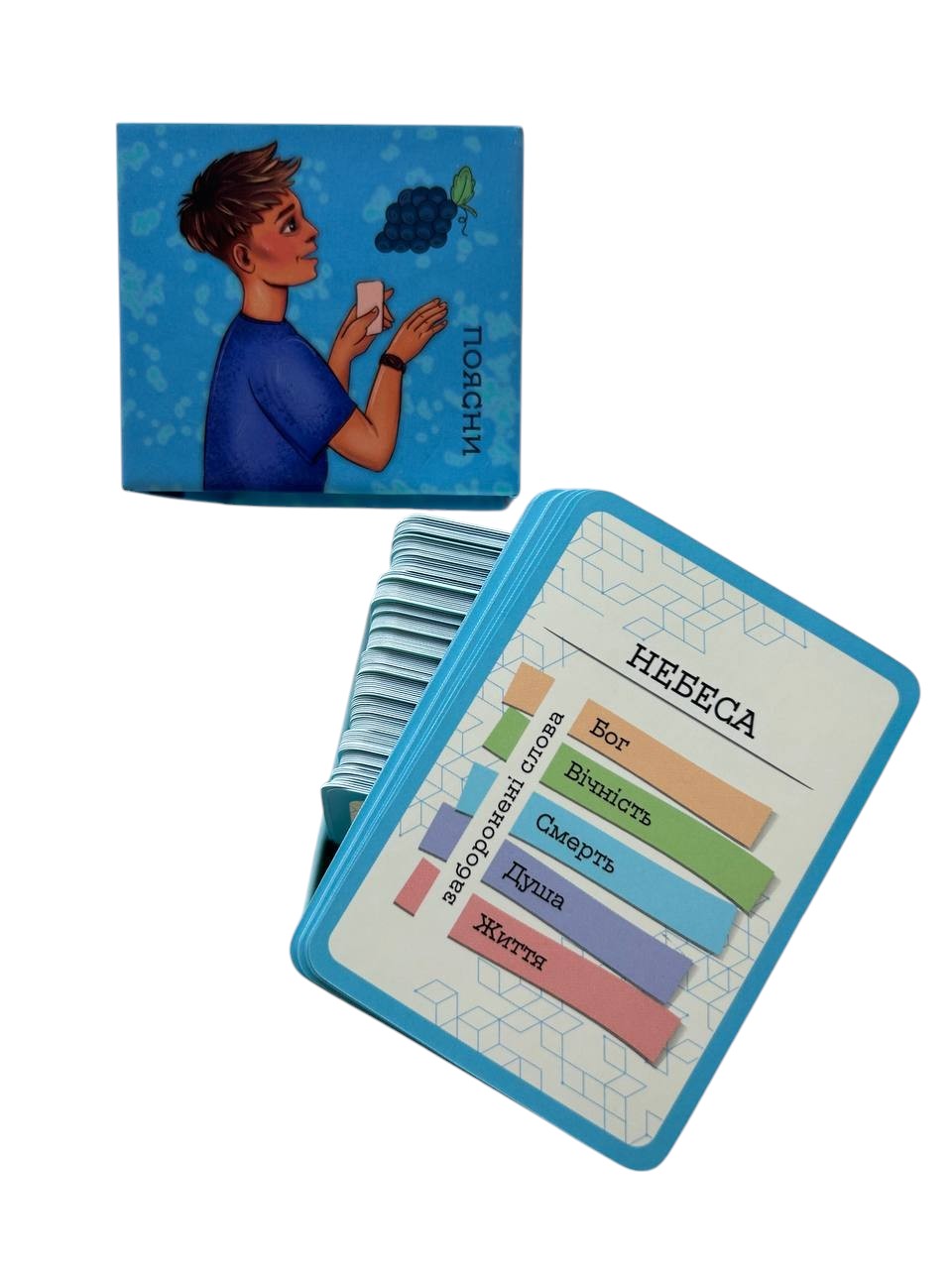 - 150 карток із словами для пояснення і забороненими словами, які не можна використовувати під час пояснення.