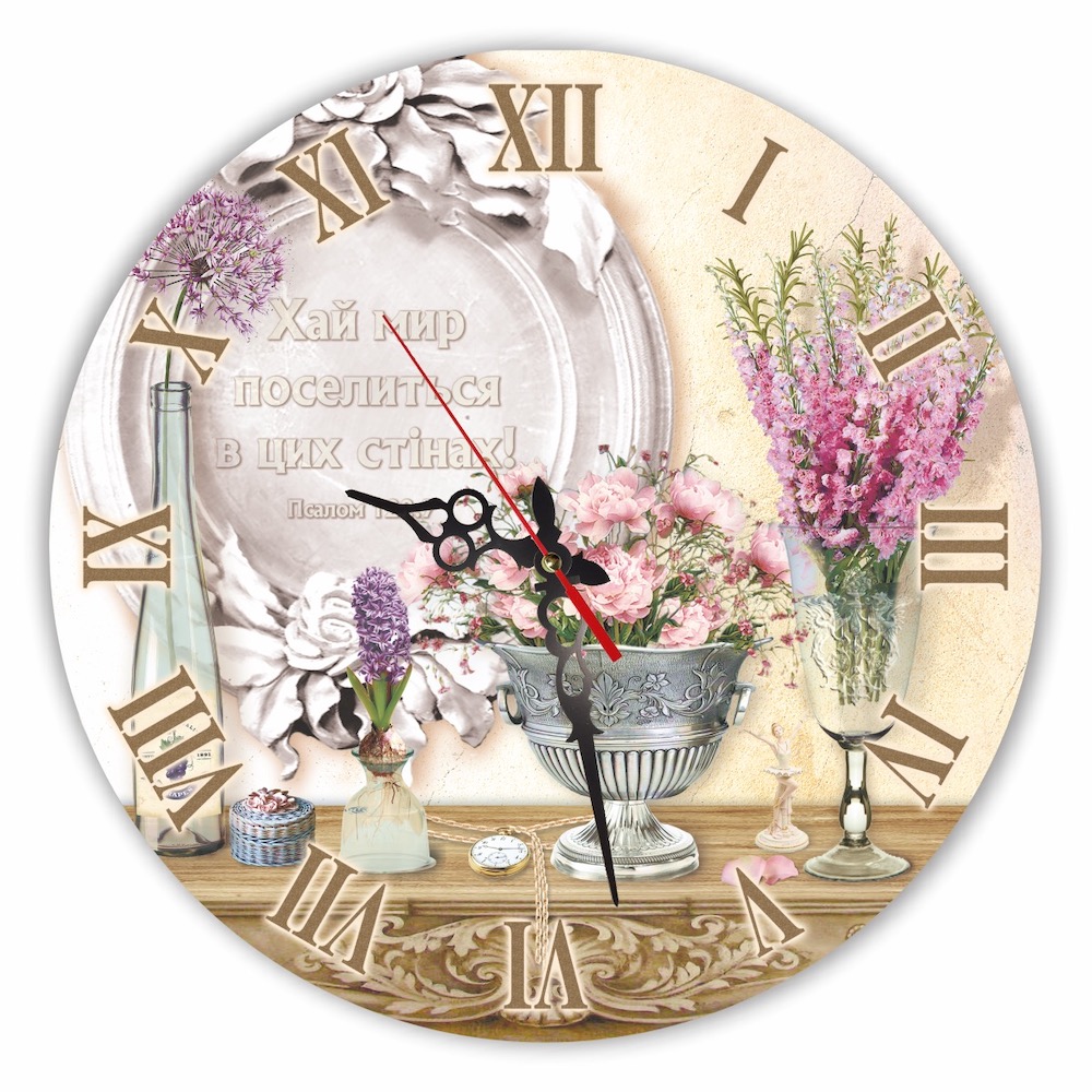 Настінний дерев'яний круглий годинник 30 см "Хай мир поселиться в ціх стінах"